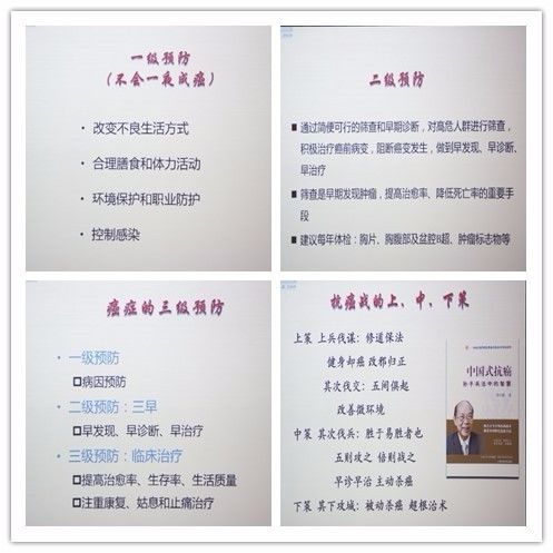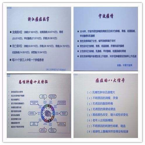 张俊教授首先介绍了“上海癌症数字”、“浙江癌症数字”及“宁波患癌率”的情况,紧接着详细阐述了“肿瘤离我们有多远”、“肿瘤的十大特征”、“癌症的八大信号”、“癌症的三级预防”等内容。张俊教授认为,对晚期肿瘤的治疗从“除瘤务尽”到“带瘤生存”的转变,在一定程度上体现了哲学思想在治癌理念演进中的融合效应。